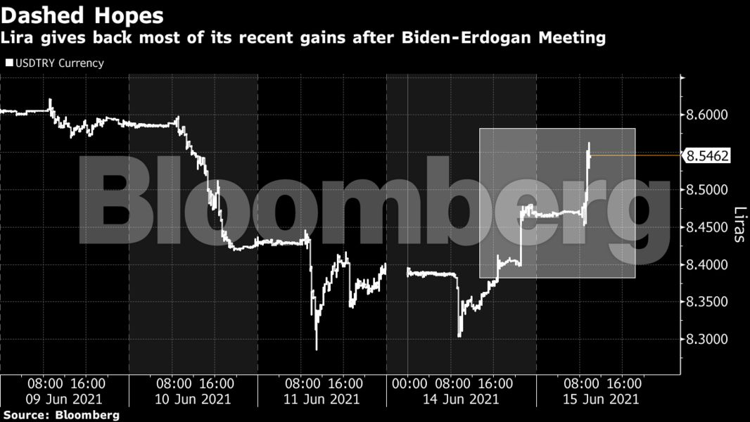 Ως εκ τούτου, η τουρκική λίρα έχανε έως και 1,5% έναντι του δολαρίου νωρίτερα σήμερα, οι μεγαλύτερες απώλειες μεταξύ των νομισμάτων των αναδυόμενων αγορών, μετά τη συνάντηση των κ.κ. Μπάιντεν και Ερντογάν, στο περιθώριο της συνόδου κορυφής του NATO.