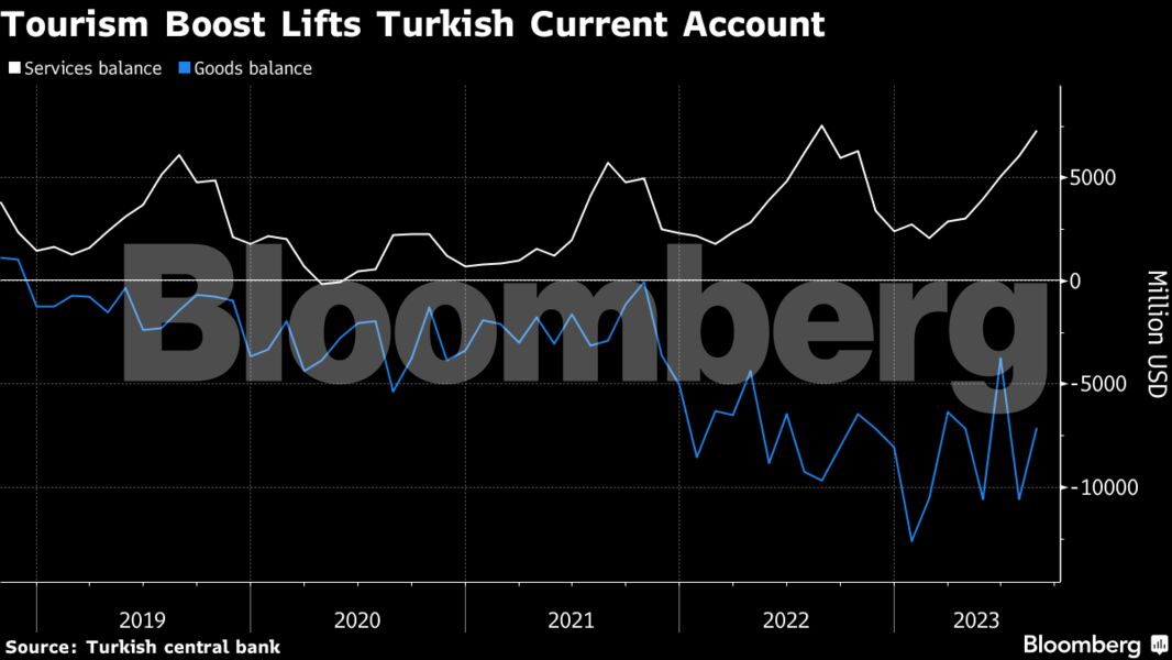 Βασικό ρόλο στη βελτίωση έπαιξε η αύξηση των ταξιδιωτικών εσόδων κατά σχεδόν 1 δισ. δολάρια από τον Ιούλιο. Αυτό οδήγησε το καθαρό πλεόνασμα της Τουρκίας στις υπηρεσίες σε 7,3 δισ. δολάρια και βοήθησε να αντισταθμιστεί το έλλειμμα αγαθών ύψους 7,1 δισ. δολαρίων.