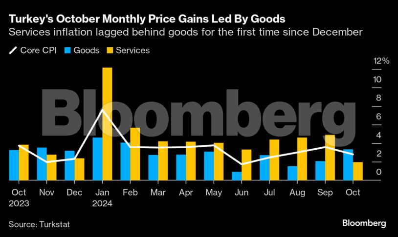 Ο πληθωρισμός επιβραδύνθηκε στο 48,6% σε ετήσια βάση τον Οκτώβριο από 49,4% τον Σεπτέμβριο, σύμφωνα με τα επίσημα στοιχεία που ανακοινώθηκαν τη Δευτέρα. Οι οικονομολόγοι που συμμετείχαν σε έρευνα του Bloomberg ανέμεναν ποσοστό 48,3%. Οι μηνιαίες τιμές, το αγαπημένο μέτρο των Τούρκων τραπεζιτών, υποχώρησαν στο 2,88% από 2,97% τον Σεπτέμβριο.