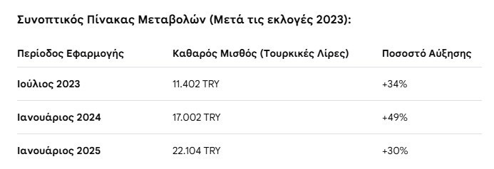 Συγκεκριμένα από τις 11.402 τουρκικές λίρες που ήταν τον Ιούλιο του 2023 ο κατώτατος μισθός αυξήθηκε κατά 34% τον Ιούλιο του 2023, φθάνοντας τις 11.402 τουρκικές λίρες, κατά 49% τον Ιανουάριο του 2024 και κατά 30% τον Ιανουάριου του 2025 φτάνοντας τις 22.104 τουρκικές λίρες.