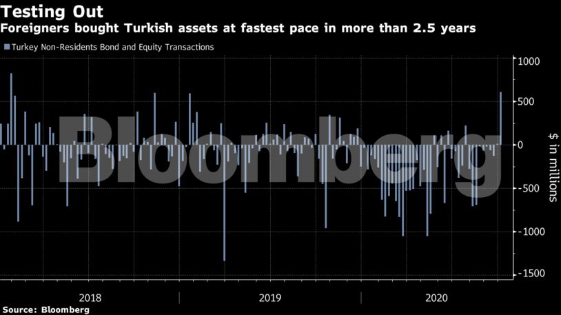 Την εβδομάδα μέχρι και τις 2 Οκτωβρίου, οι ξένοι επενδυτές αγόρασαν τουρκικά assets αξίας 610 εκατ. δολαρίων, σύμφωνα με τα τελευταία στοιχεία της Κεντρικής Τράπεζα της Τουρκίας. Πρόκειται για τις μεγαλύτερες εισροές από τον Ιανουάριο του 2018 και μάλιστα σε μια συγκυρία όπου η λίρα διολίσθησε σε νέα ιστορικά χαμηλά, παρά την αύξηση των επιτοκίων από την κεντρική Τράπεζα – μια κίνηση που ελάχιστοι οικονομολόγοι ανέμεναν ότι θα συμβεί.