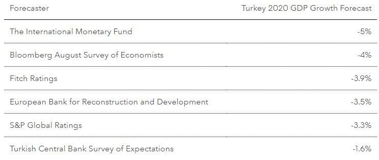Η εκστρατεία του Ερντογάν για την τόνωση της οικονομίας μπορεί να μην τη σώσει τελικά από τη χειρότερη ετήσια συρρίκνωση στην ιστορία της, με το Διεθνές Νομισματικό Ταμείο να προβλέπει ότι θα μπορούσε να υποχωρήσει κατά 5%. Ο υπουργός Οικονομικών Μπεράτ Αλμπαϊράκ είναι πιο αισιόδοξος, εκτιμώντας τις φετινές επιδόσεις μεταξύ -2% και +1%.