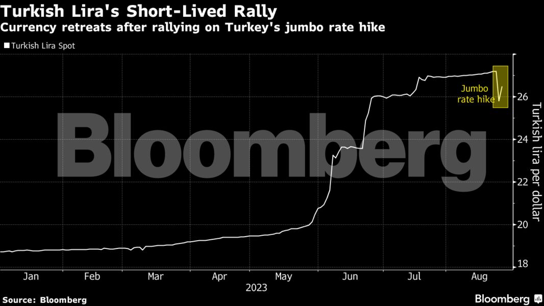 Το τουρκικό νόμισμα σημείωσε πτώση σήμερα καθώς η ευφορία γύρω από τη χθεσινή jumbo αύξηση των επιτοκίων υποχώρησε, καθώς οι επενδυτές αναρωτιούνται εάν η επιθετική κίνηση έχει την ευλογία του προέδρου Ρετζέπ Ταγίπ Ερντογάν.