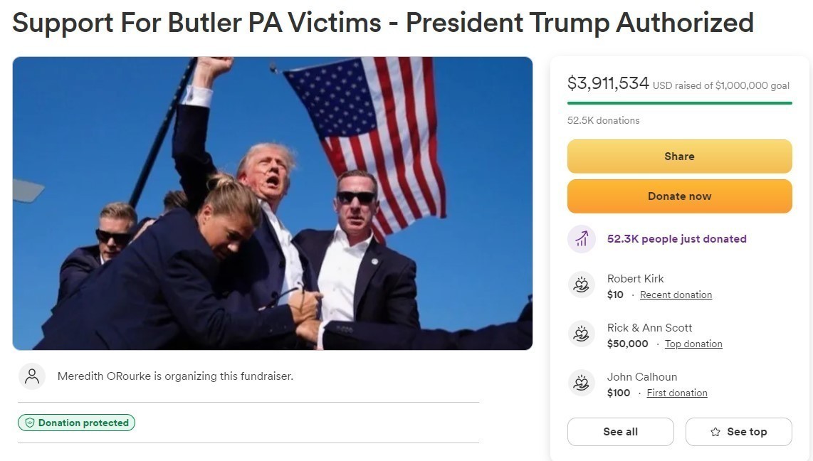 Η καμπάνια του Τραμπ ξεκίνησε την πρωτοβουλία στο GoFundMe υπέρ των θυμάτων επισημαίνοντας πως όλες οι δωρεές «θα πάνε στους υπερήφανους Αμερικανούς που θρηνούν και προσπαθούν να ανακάμψουν (από την επίθεση)».