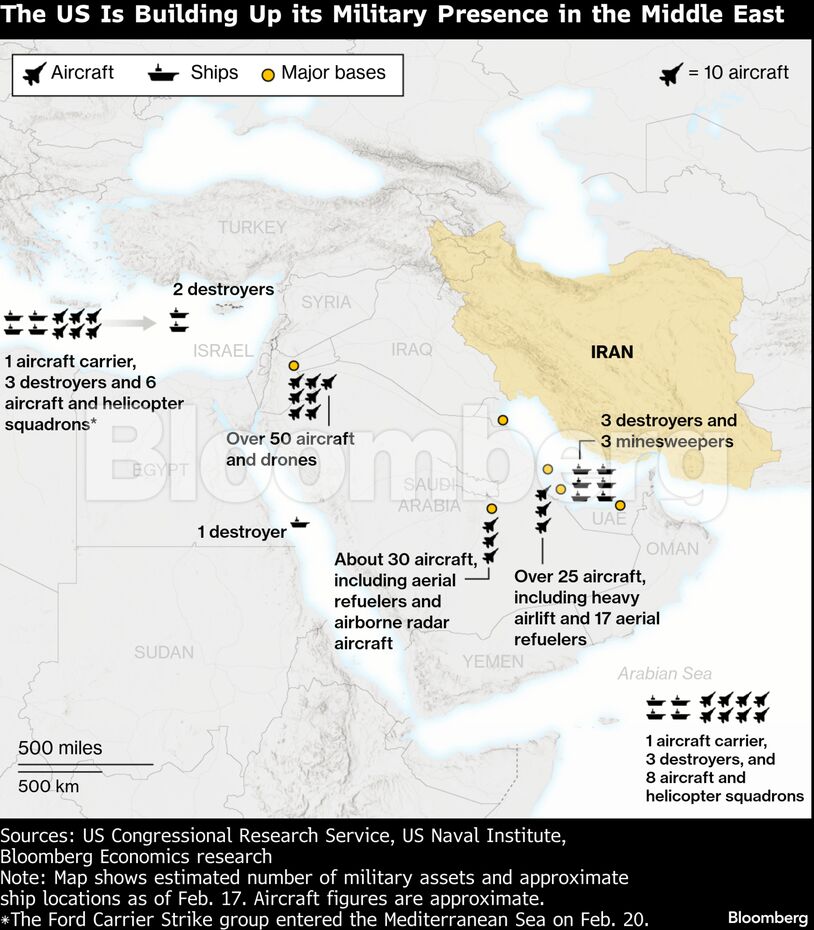 Το Πεντάγωνο έχει αναπτύξει ισχυρές στρατιωτικές δυνάμεις στην περιοχή, συμπεριλαμβανομένων δύο αεροπλανοφόρων, μαχητικών αεροσκαφών και αεροσκαφών ανεφοδιασμού, παρέχοντας στον Τραμπ τη δυνατότητα να διατάξει είτε περιορισμένες είτε εκτεταμένες επιχειρήσεις κατά του Ιράν.