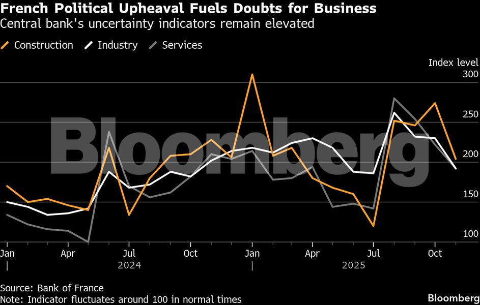 Ο μηνιαίος δείκτης αβεβαιότητας της Τράπεζας της Γαλλίας έχει αποκλιμακωθεί ελαφρώς καθώς οι συζητήσεις για τον προϋπολογισμό προχωρούν, παραμένει όμως ψηλά συγκριτικά με ήρεμες περιόδους. Εξακολουθεί μάλιστα να κινείται κοντά στα επίπεδα που καταγράφονται σε προεκλογικές φάσεις ή σε καταρρεύσεις κυβερνήσεων.