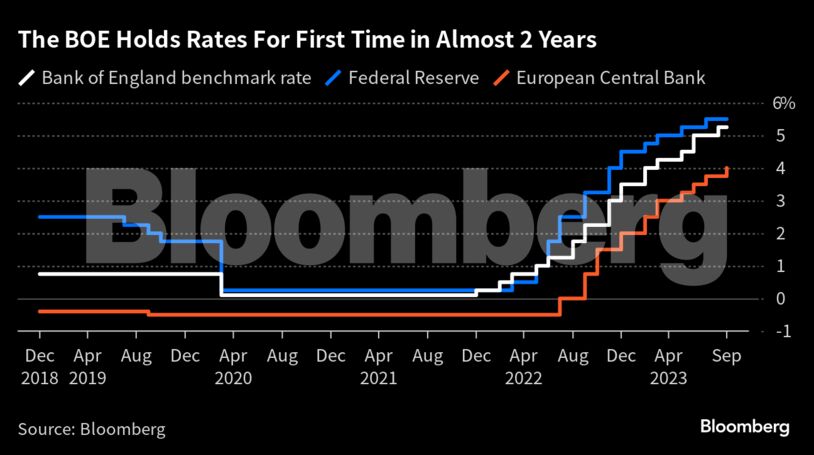 Ο Διοικητής Αντριου Μπέιλι αντέκρουσε τις εικασίες περί περικοπών, λέγοντας ότι η συζήτηση είναι πρόωρη, ενώ ο πληθωρισμός παραμένει πολύ πάνω από τον στόχο του 2%. Η Ομοσπονδιακή Τράπεζα των ΗΠΑ άφησε την Τετάρτη ανοιχτή την προοπτική μιας περαιτέρω αύξησης, παρά τα αυξανόμενα στοιχήματα ότι η επόμενη κίνηση θα αναφέρεται σε μείωση. Η Ευρωπαϊκή Κεντρική Τράπεζα έθεσε επίσης τον κύκλο αυξήσεων σε παύση την περασμένη εβδομάδα, με την πρόεδρο Κριστίν Λαγκάρντ να χαρακτηρίζει κάθε εικασία για μείωση των επιτοκίων «εντελώς πρόωρη».