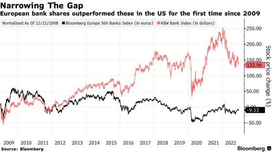 Μετά από μία δεκαετία πρωτοκαθεδρίας της Wall Street, οι ευρωπαϊκές τράπεζες απολαμβάνουν μία σπάνια περίοδο υπεραποδόσεων η οποία οφείλεται κυρίως στην επιθετική αύξηση των επιτοκίων της ΕΚΤ. Έχοντας μειώσει τα λειτουργικά τους κόστη κατά τη διάρκεια της κρίσης της Ευρωζώνης, οι τράπεζες αυτές θα βγουν κερδισμένες αφού η αύξηση του δανεισμού θα οδηγήσει σε περαιτέρω επενδύσεις και θα απορροφήσει τυχόν απώλειες κατά τη διάρκεια της τρέχουσας οικονομικής κρίσης.