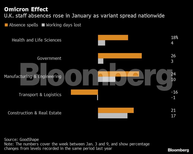 Η ταχύτατη εξάπλωση της Όμικρον αύξησε δραματικά τον αριθμό των απουσιών από την εργασία στο Ηνωμένο Βασίλειο κατά την πρώτη εβδομάδα του 2022, σύμφωνα με ανάλυση που πραγματοποιήθηκε για λογαριασμό του Bloomberg.