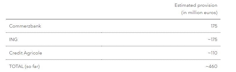 Ενώ μόνο τρεις από τους μεγαλύτερους δανειστές της γερμανικής εταιρεία πληρωμών έχουν αναφέρει κέρδη μέχρι στιγμής, όλοι χρειάστηκε να προχωρήσουν σε προβλέψεις για την έκθεσή τους στην Wirecard. Η Commerzbank AG και η ING Groep NV εκτίμησαν το μέγεθος της έκθεσής τους στα περίπου 175 εκατ. ευρώ η καθεμία, σύμφωνα με ανθρώπους που γνωρίζουν το θέμα, ποσό που εντοπροσωπεύει πάνω από το μισό των κερδών τους για το δεύτερο τρίμηνο. Για την Credit Agricole SA η ζημιά που υπέστη υπολογίζεται στα περίπου 110 εκατ. ευρώ.