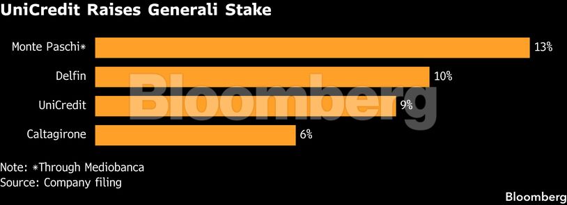 Η συμμετοχή που αποκαλύφθηκε τώρα δίνει στη UniCredit σημαντική επιρροή στην ασφαλιστική εταιρεία, η οποία είναι μία από τις επιχειρήσεις που επηρεάζονται από το κύμα συμφωνιών που αναδιαμορφώνει τον τομέα των χρηματοπιστωτικών υπηρεσιών της Ιταλίας. Όπως αναφέρει το Bloomberg, ο Ορσέλ έχει δηλώσει επανειλημμένα ότι δεν έχει στρατηγικό ενδιαφέρον για την εταιρεία, ωστόσο μια πρόσφατη σύγκρουση για τη διακυβέρνηση στην Banca Monte dei Paschi di Siena, η οποία έγινε πρόσφατα ο μεγαλύτερος μέτοχος της Generali, έχει τροφοδοτήσει εικασίες για περαιτέρω στρατηγικές κινήσεις που θα μπορούσαν να εμπλέξουν την ασφαλιστική.