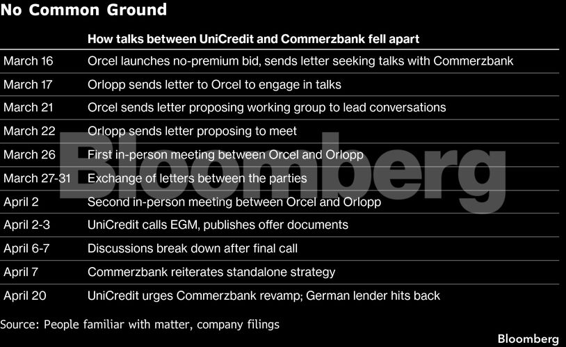 Αυτή η περιγραφή της μάχης για την εξαγορά και οι απόψεις των δύο πλευρών βασίζονται σε συνεντεύξεις με άτομα που είναι εξοικειωμένα με το θέμα και ζήτησαν να παραμείνουν ανώνυμα. Οι εκπρόσωποι της Commerzbank και της UniCredit, σύμφωνα με το Bloomberg, αρνήθηκαν να σχολιάσουν.