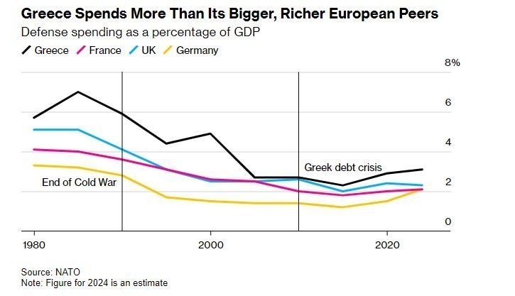 Καθώς η Ευρώπη αναζητά τρόπους να αυξήσει τις στρατιωτικές δαπάνες απέναντι στην απειλή της Ρωσίας, η Ελλάδα προσφέρει πολύτιμα μαθήματα για το τι απαιτείται όταν ζεις δίπλα σε έναν αντίπαλο. Παρόλο που η χώρα των 10 εκατομμυρίων κατοίκων διατηρεί ισχυρές ένοπλες δυνάμεις ανεξαρτήτως κόστους, έχει δυσκολευτεί να αναπτύξει μια ισχυρή εγχώρια αμυντική βιομηχανία σημειώνει σε άρθρο του το Bloomberg.