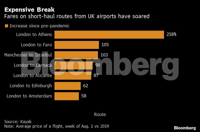 Σύμφωνα με το ταξιδιωτικό πρακτορείο Kayak, oι αεροπορικοί ναύλοι την πρώτη εβδομάδα του Αυγούστου, τον μήνα αιχμής για τα ταξίδια στο Ηνωμένο Βασίλειο, αυξήθηκαν κατά 30% κατά μέσο όρο για τα 36 κορυφαία δρομολόγια σε σύγκριση με τα προ της πανδημίας επίπεδα.