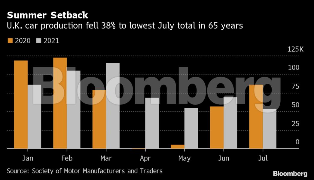 Η παραγωγή αυτοκινήτων στο Ηνωμένο Βασίλειο μειώθηκε τον Ιούλιο στα επίπεδα που οι βρετανικές αυτοκινητοβιομηχανίες είχαν να δουν εδώ και 65 χρόνια, καθώς οι ελλείψεις ημιαγωγών και προσωπικού έχουν επιφέρει ισχυρό πλήγμα στον κλάδο.