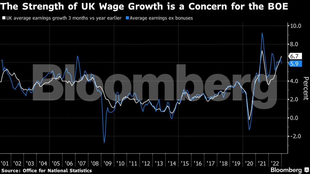 Οι μισθοί του ιδιωτικού τομέα αυξήθηκαν κατά 7,3%, ποσοστό ρεκόρ, ενώ στο Δημόσιο η αύξηση ήταν της τάξης του 4,2%. Η BOE αύξησε τα επιτόκια από 0,1% σε 4% εφαρμόζοντας τον ταχύτερο κύκλο αυστηροποίησης της πολιτικής της από τα τέλη της δεκαετίας του 1980. Οι αγορές αναμένουν τα επιτόκια να κορυφωθούν στο 4,5% μέχρι τα μέσα του έτους. Οι έρευνες δείχνουν ότι οι πιέσεις στην αγορά εργασίας μειώνονται μαζί με έναν αυξανόμενο κίνδυνο ύφεσης. Η έντονη έλλειψη εργατικου δυναμικού δίνει ώθηση στις μισθολογικές απαιτήσεις σε πολλούς τομείς. Η ανεργία διαμορφώθηκε στο 3,7%, κοντά στο χαμηλότερο ποσοστό από τη δεκαετία του 1970.