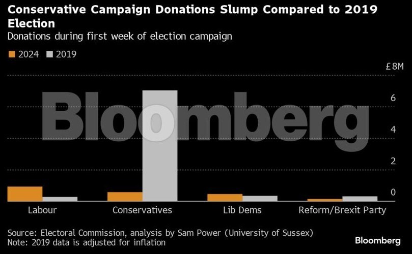 Σύμφωνα με το Bloomberg οι Εργατικοί έλαβαν σχεδόν το διπλάσιο ποσό χρημάτων από πολιτικές δωρεές σε σχέση με τους Τόρις, κατά την πρώτη επίσημη εβδομάδα προεκλογικής εκστρατείας.