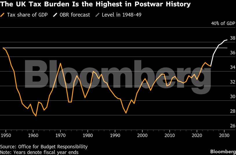 Για να καθησυχάσει τις αγορές και να ενισχύσει το περιθώριό της έναντι των δημοσιονομικών κανόνων, η Ριβς αναγκάστηκε να αυξήσει τους φόρους κατά 26 δισ. λίρες στον προϋπολογισμό, οδηγώντας το φορολογικό βάρος στο υψηλότερο επίπεδο όλων των εποχών, στο 38% του ΑΕΠ.