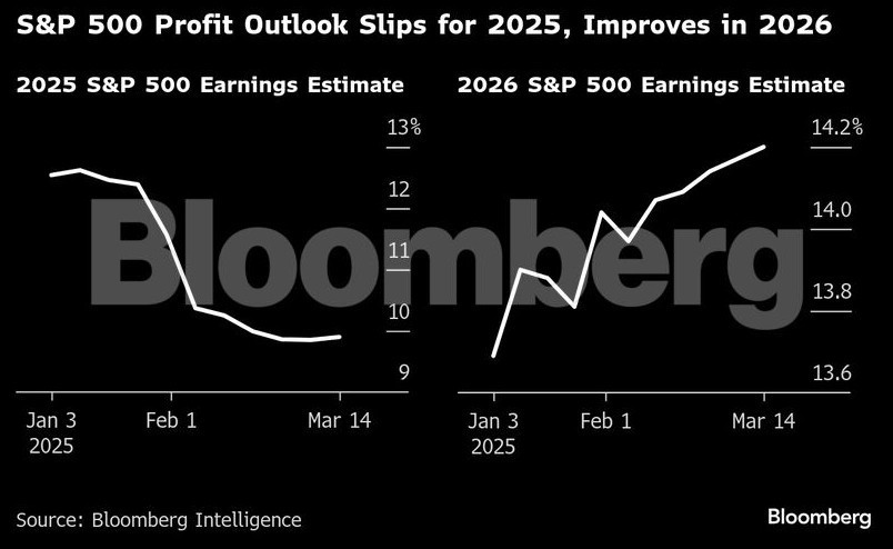 Οι αναλυτές εξακολουθούν να προβλέπουν αύξηση κερδών 10% για τις εταιρείες του S&P 500 το 2025, αν και αυτός ο αριθμός έχει υποχωρήσει από το 13% που προβλεπόταν στις αρχές Ιανουαρίου. Ωστόσο, υπάρχει περιθώριο για περαιτέρω μειώσεις.