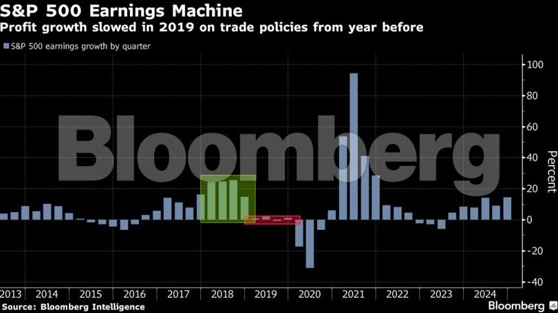 Ο Μάικλ Κάσπερ, στρατηγικός αναλυτής της Bloomberg Intelligence, υπενθύμισε ότι κατά την πρώτη θητεία Τραμπ το 2018, ο εμπορικός πόλεμος με την Κίνα κλιμακώθηκε στους πρώτους μήνες του έτους, αλλά το πλήγμα στα εταιρικά κέρδη φάνηκε σχεδόν ένα χρόνο αργότερα. Ωστόσο, σημείωσε ότι τότε η οικονομία είχε το πλεονέκτημα των μεγάλων φορολογικών περικοπών που είχε δρομολογήσει ο Τραμπ.