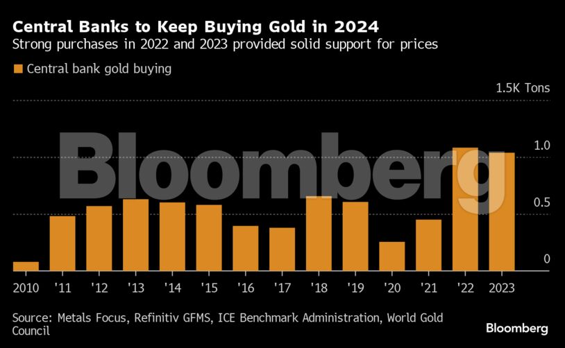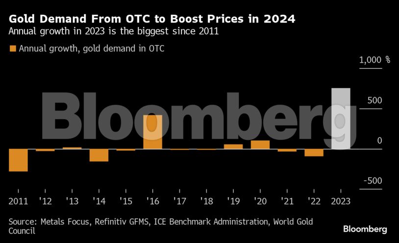 Η συνολική ζήτηση για χρυσό σημείωσε ρεκόρ πέρυσι και αναμένεται να αυξηθεί και πάλι το 2024, καθώς η Ομοσπονδιακή Κεντρική Τράπεζα των ΗΠΑ κινείται προς μείωση των επιτοκίων, ενισχύοντας ενδεχομένως τις τιμές, σύμφωνα με το Παγκόσμιο Συμβούλιο Χρυσού (WGC).