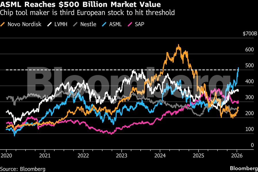 Ο ολλανδικός κατασκευαστής εξοπλισμού ημιαγωγών ενισχύθηκε έως και 7,6% την Πέμπτη στο Άμστερνταμ, διευρύνοντας τα κέρδη του από την αρχή του έτους στο 24%. Η ASML είναι μόλις η τρίτη ευρωπαϊκή εταιρεία που ξεπερνά το ορόσημο των 500 δισ. δολαρίων, μετά τον όμιλο πολυτελών ειδών LVMH και τη δανέζικη φαρμακοβιομηχανία Novo Nordisk A/S.