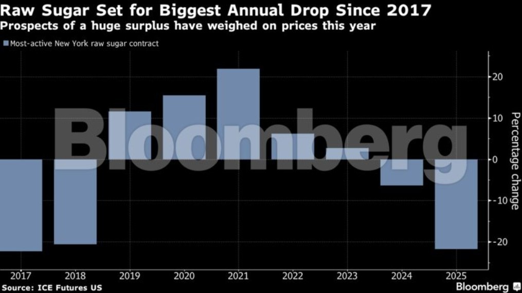 Η ακατέργαστη ζάχαρη οδεύει προς τη μεγαλύτερη ετήσια πτώση από το 2017, καθώς οι τιμές πιέζονται από τις προοπτικές άφθονων αποθεμάτων. Παρότι το πιο ενεργό συμβόλαιο στη Νέα Υόρκη κινήθηκε ανοδικά την Τετάρτη, συνολικά οι τιμές έχουν υποχωρήσει περίπου 22% μέσα στο 2025.