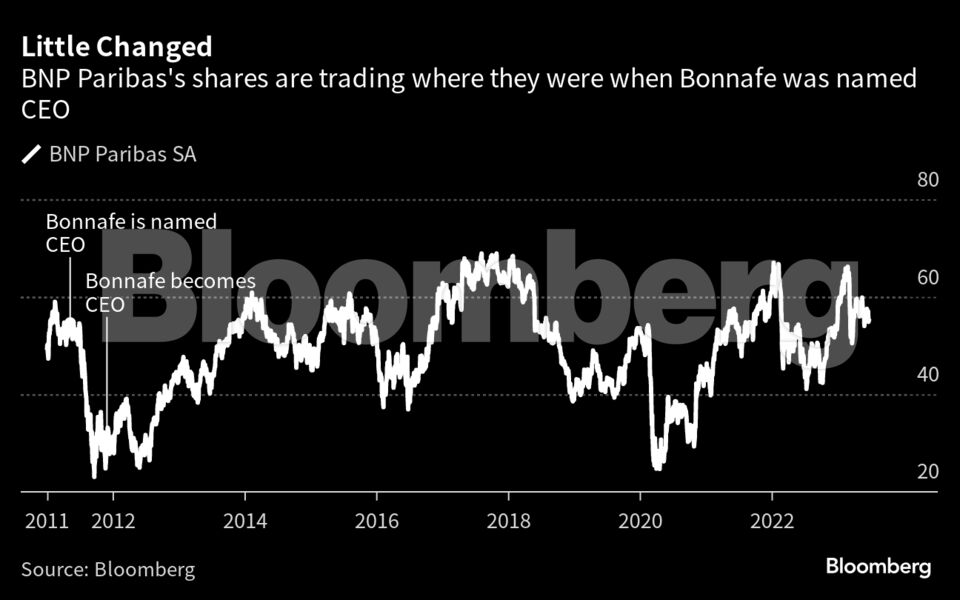 Από τα πρώτα κιόλας χρόνια της θητείας του Μποναφέ, οι μετοχές της εταιρείας έχουν κινηθεί συντηρητικά για σχεδόν μια δεκαετία. Και παρά το γεγονός, ότι είναι η πιο κερδοφόρα τράπεζα με επίκεντρο την Ευρώπη και υπόσχεται σταθερή ανάπτυξη και περισσότερες εξαγορές, η BNP Paribas διαπραγματεύεται τώρα περισσότερο από 40% κάτω από τη λογιστική της αξία, μια μεγαλύτερη έκπτωση από τον μέσο όρο των μεγάλων ευρωπαϊκών τραπεζών.