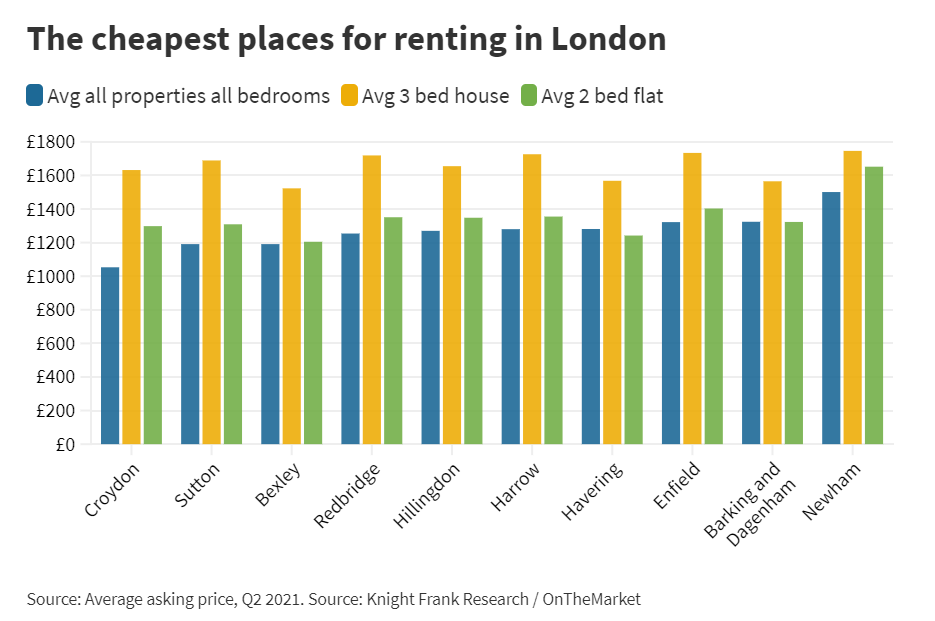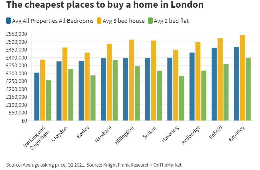 Σύμφωνα όμως, με στοιχεία που δημοσιεύτηκαν από την πολυεθνική εταιρεία Knight Frank, ηγέτιδα στο χώρο του real estate, υπάρχουν κάποιες περιοχές στο Λονδίνο οι οποίες είναι σαφώς πιο προσιτές και οικονομικές σε σύγκριση με άλλες. Για παράδειγμα, κατά τη διάρκεια του δεύτερου τριμήνου του 2021, ο δήμος Μπάρκιγκ και Ντάγκεγχαμ υπήρξε η περιοχή με τις πιο χαμηλές τιμές στην αγορά ακινήτων.