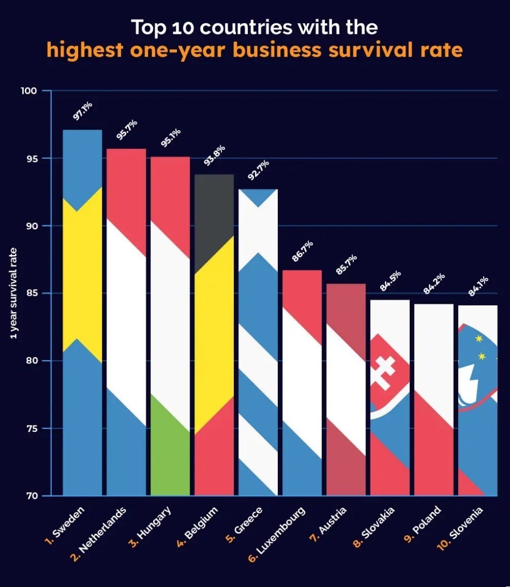 Η ετήσια ανάλυση των ειδικών υποδεικνύει πως το 92,7% των νέων εταιρειών επιβιώνουν του πρώτου έτους λειτουργίας τους στην Ελλάδα, με τον μέσο όρο στην Γηραιά Ήπειρο να κυμαίνεται στο 82,5%. Η χώρα ακολουθεί τις Σουηδία, Ολλανδία, Ουγγαρία και Βέλγιο.