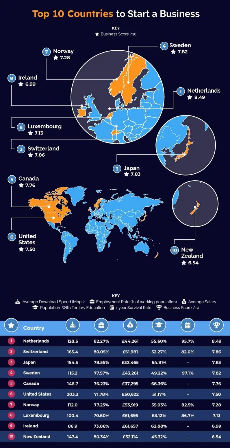 Βάσει των αποτελεσμάτων της έρευνας, η Ολλανδία αποτελεί το καλύτερο μέρος για τη δημιουργία μίας νέας επιχείρησης στην υφήλιο, με σκορ 8,49/10. Στη δεύτερη θέση βρίσκεται η Ελβετία και στην τρίτη η Ιαπωνία.