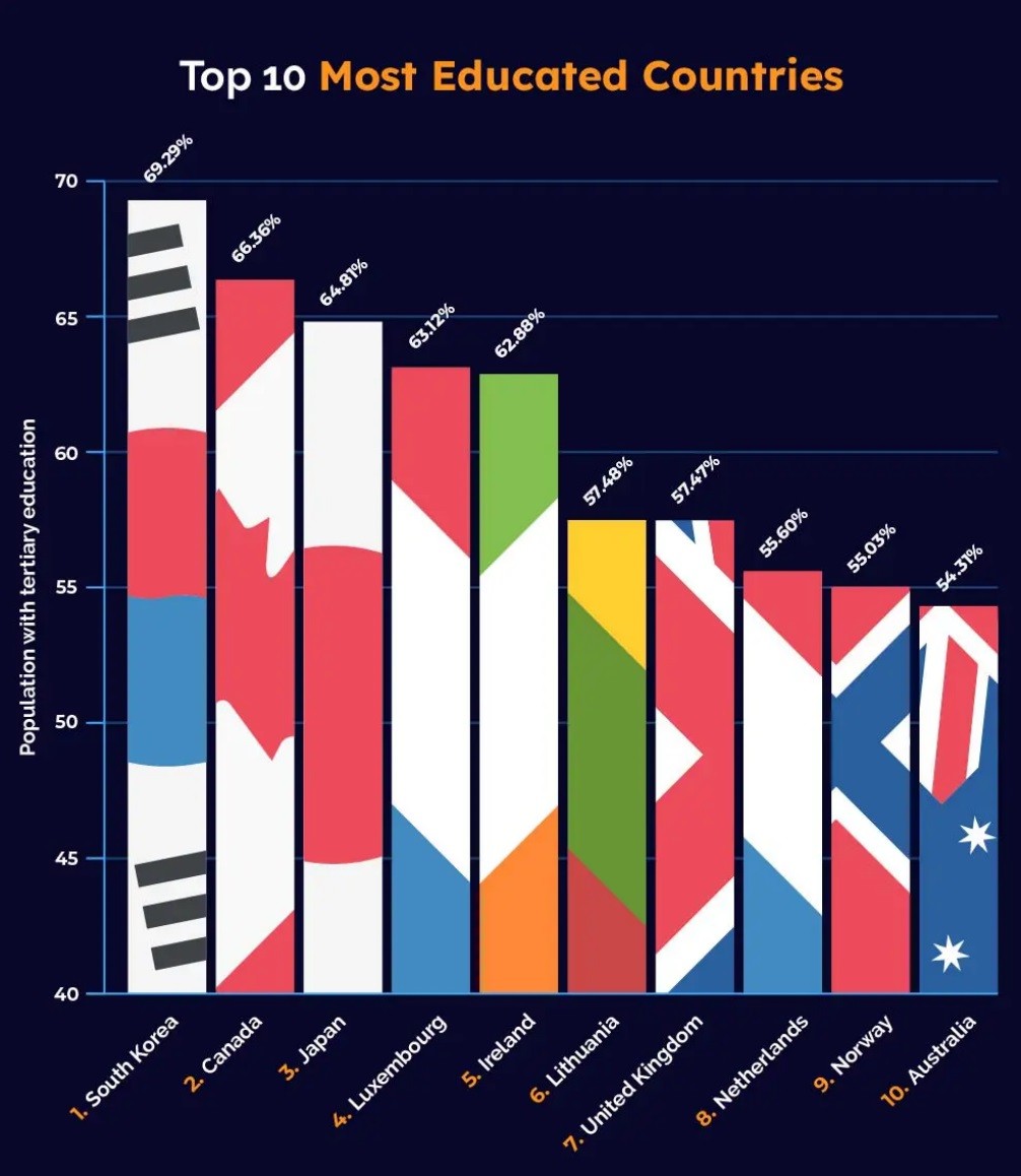 H Νότια Κορέα αποτελεί τη χώρα με το μεγαλύτερο μέσο επίπεδο εκπαίδευσης. Η μεθοδολογία υπολογισμού του εκπαιδευτικού επιπέδου μελετά το ποσοστό του πληθυσμού το οποίο έχει ολοκληρώσει τριτοβάθμια εκπαίδευση. Την δεύτερη θέση κατέκτησε ο Καναδάς, με την Ιαπωνία να κατακτά την τρίτη με ποσοστό 64,81%.