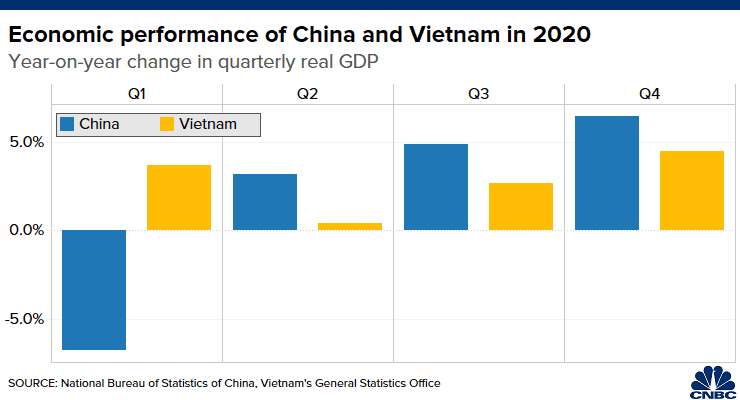 Σύμφωνα με το CNBC που επικαλείται επίσημα στοιχεία από διάφορες πηγές, όπως το ΔΝΤ, το Βιετνάμ είχε καλύτερες επιδόσεις τόσο σε επίπεδο δ’ τριμήνου, όσο και σε ετήσια βάση, έναντι όλων των γειτονικών της χωρών το 2020.