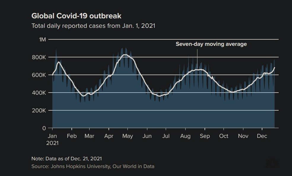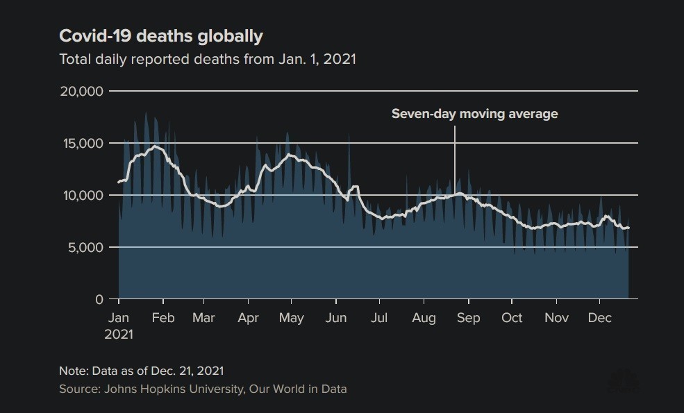 Τα δεδομένα της πανδημίας, συμπεριλαμβανόμενων και των εισαγωγών στα νοσοκομεία, τα κρούσματα και τους θανάτους πιθανώς δεν επιδεικνύουν τη σοβαρότητα της κατάστασης λόγω της έλλειψης τεστ και της ποιότητας καταγραφής των δεδομένων στις τέσσερις γωνιές του κόσμου. Παρ’ όλα αυτά, το πρακτορείο CNBC παρέχει τέσσερα γραφήματα τα οποία περιγράφουν την κατάσταση συνολικά λίγο πριν εισέλθουμε στο 2022.