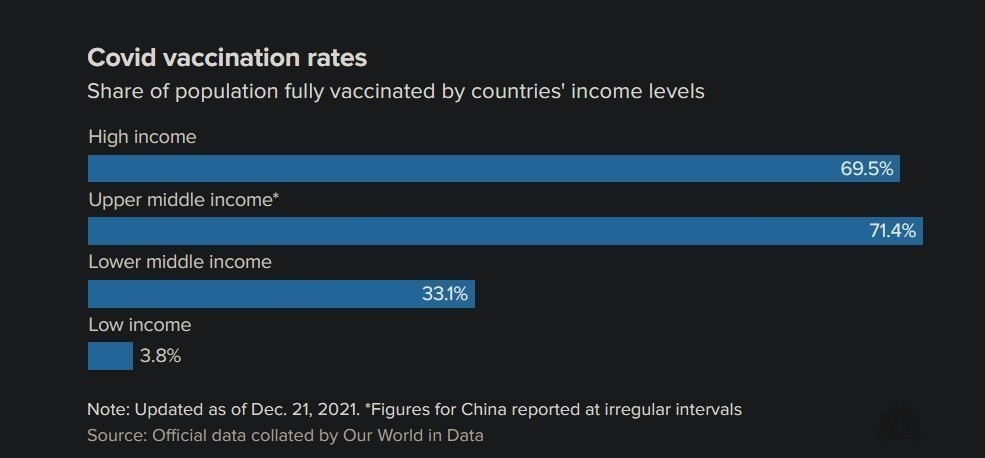 Πάνω από 30 χώρες έχουν ποσοστό εμβολιασμού υπό του 10%. Οι περισσότερες από τις χώρες αυτές βρίσκονται στην Αφρική.