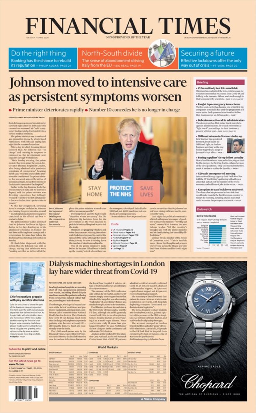 Οι Financial Times γράφουν ότι ο Τζόνσον «μεταφέρθηκε στην εντατική καθώς επιδεινώθηκαν τα επίμονα συμπτώματα» και ότι ο πρωθυπουργός όπως αναγνωρίζουν οι υπηρεσίες του δεν κρατάει αυτή τη στιγμή τα ηνία της κυβέρνησης.