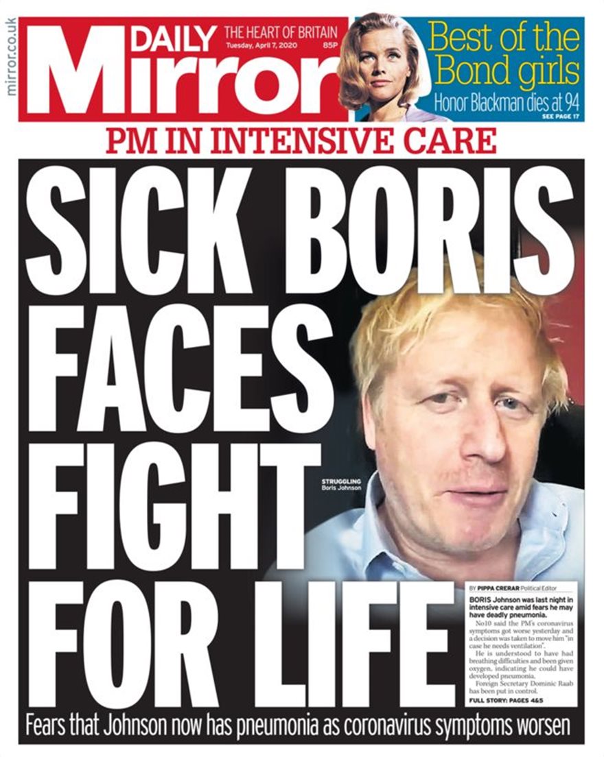 Η Daily Mirror με τίτλο «Ο άρρωστος Μπόρις αντιμέτωπος με τον αγώνα για τη ζωή» αναφέρεται στις ανησυχίες ότι ο πρωθυπουργός έχει πνευμονία, καθώς επιδεινώθηκαν τα συμπτώματα.