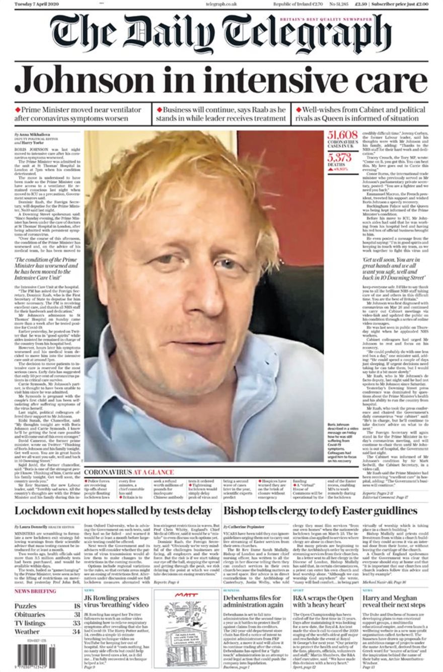 Η Daily Telegraph με τίτλο «Ο Τζόνσον στην εντατική» αναφέρει ότι ο πρωθυπουργός μεταφέρθηκε σε ΜΕΘ μετά την επιδείνωση των συμπτωμάτων, για την περίπτωση που χρειαστεί αναπνευστική υποστήριξη, ενώ δημοσιεύει δηλώσεις του Ντόμινικ Ράαμπ, που αναπληρώνει τον πρωθυπουργό κατά την ανάρρωσή του. Αναφέρεται στις ευχές για ανάρρωση στον πρωθυπουργό από το υπουργικό του συμβούλιο αλλά και πολιτικούς του αντιπάλους, όπως και στην ενημέρωση της βασίλισσας Ελισάβετ για την κατάσταση της υγείας του πρωθυπουργού.