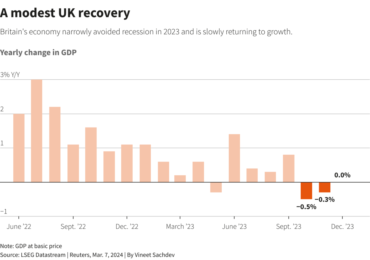 Η οικονομία της Βρετανίας έχει αποφύγει οριακά την ύφεση, καθώς η επιχειρηματική δραστηριότητα επεκτείνεται με υγιή ρυθμό και οι καταναλωτές επιστρέφουν στα μαγαζιά με αυξημένη δυναμική, παρά το υψηλό επίπεδο των επιτοκίων και τον επίμονο πληθωρισμό.