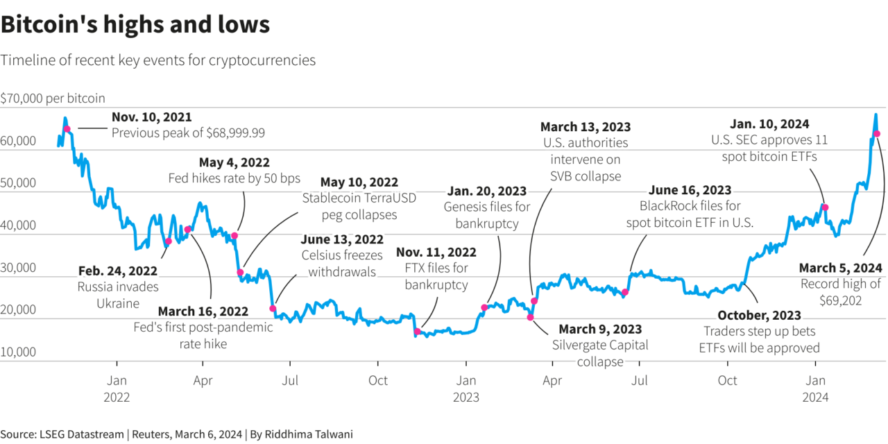 Το bitcoin σημείωσε νέο ιστορικό υψηλό πάνω από τα 69.000 δολάρια, φέρνοντάς το πίσω στο σημείο όπου βρισκόταν τον Νοέμβριο του 2021, όταν τα επιτόκια ήταν χαμηλά και oι όροι blockchain και Web3 κυκλοφορούσαν παντού.