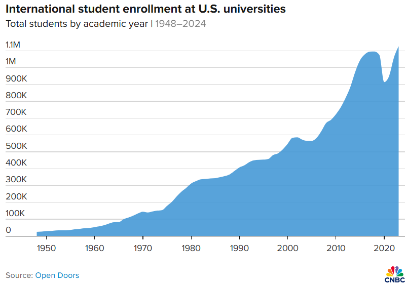 Ακολουθεί γράφημα με τον αριθμό των διεθνών φοιτητών στα πανεπιστήμια των ΗΠΑ ανά ακαδημαϊκό έτος (1948–2024):