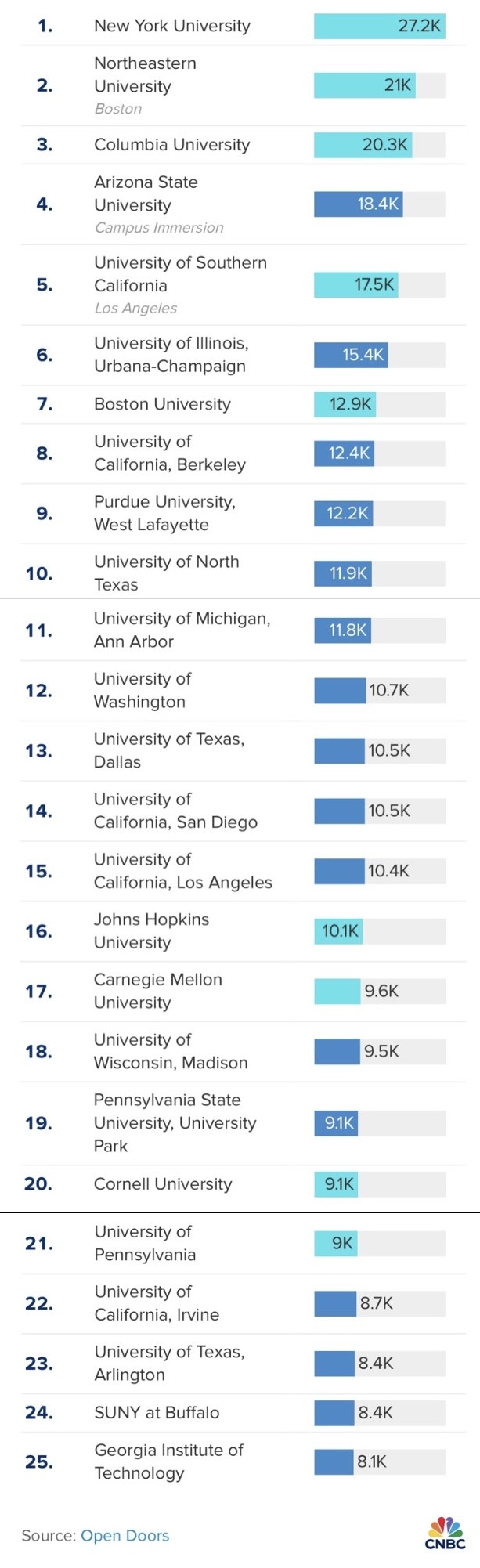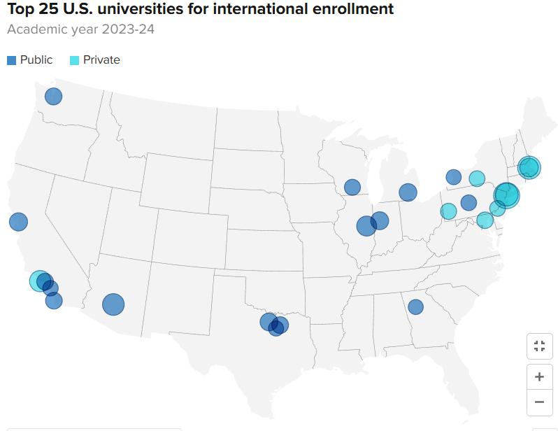Ακολουθεί κατάταξη και σχετικός χάρτης με τις 25 κορυφαίες πανεπιστημιακές σχολές των ΗΠΑ για διεθνείς φοιτητές (2023–24):