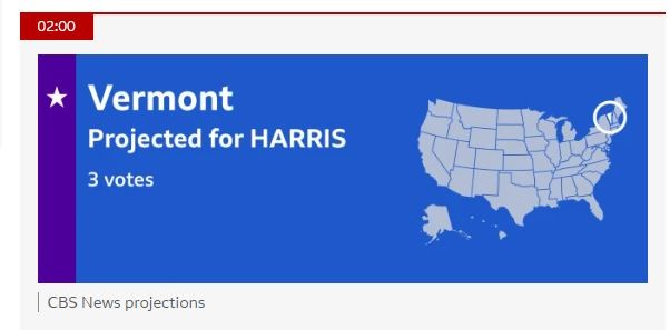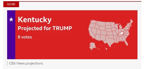 Το Κεντάκι και την Ιντιάνα με 8 και 11 εκλέκτορες κερδίζει ο Ντόναλντ Τραμπ, ενώ η Κάμαλα Χάρις κερδίζει το Βερμόντ και τους 3 εκλέκτορές του, σύμφωνα με τις προβλέψεις.