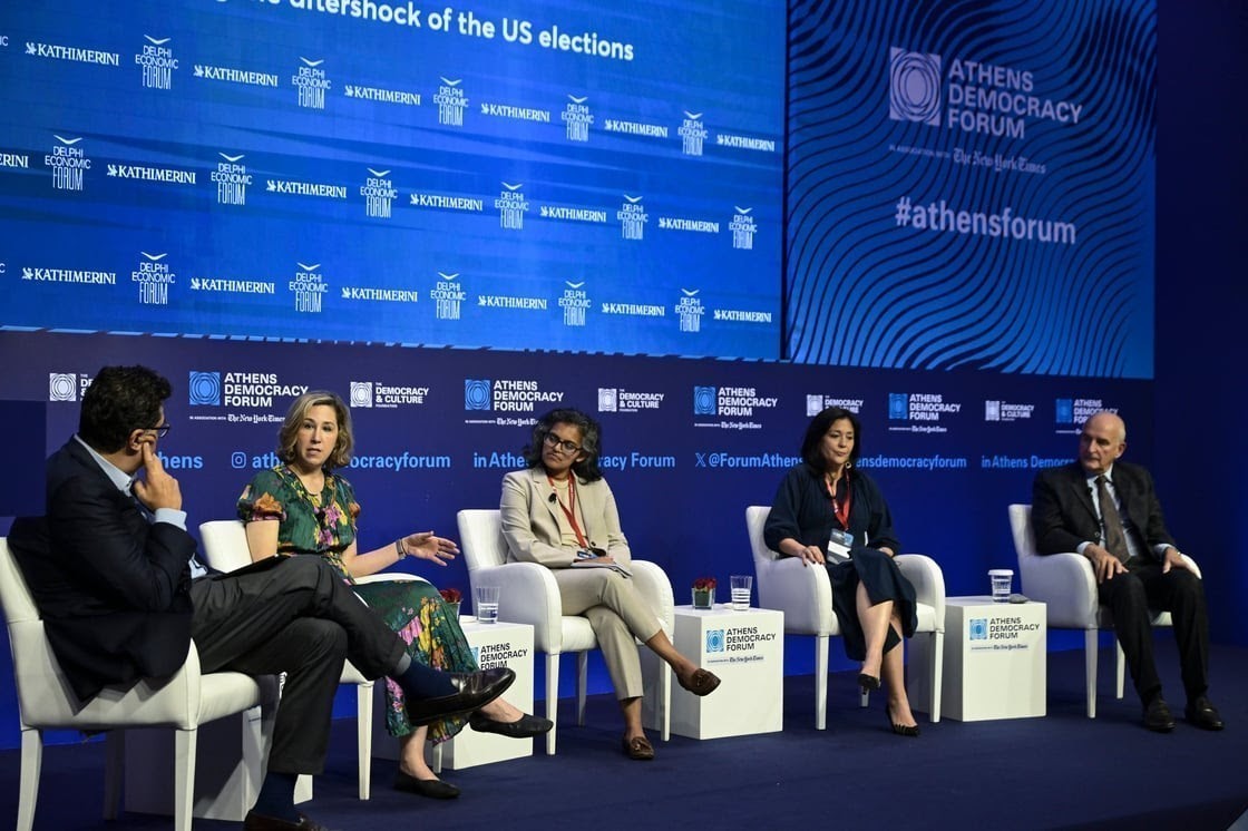 Λεζάντα κεντρικής φωτογραφίας: Από αριστερά: Αλέξης Παπαχελάς, Executive Editor, Καθημερινή – Pamela Paul, Αρθρογράφος, The New York Times – Jyoti Thottam, Senior Editor and Member of the Editorial Board, The New York Times – Liz Alderman, Chief European Business Correspondent, The New York Times – Roger Cohen, Paris Bureau Chief, The New York Times and Host, Athens Democracy Forum