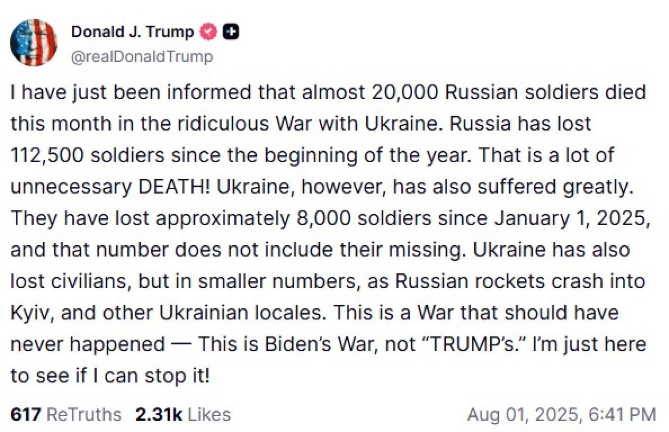 Συγκεκριμένα, σε ανάρτησή του στην πλατφόρμα Truth Social, ανέφερε πως, μόνο μέσα στον Ιούλιο, σχεδόν 20.000 Ρώσοι στρατιώτες σκοτώθηκαν, ενώ οι συνολικές απώλειες της Ρωσίας από την αρχή του έτους ανέρχονται σε 112.500. Παράλληλα, σύμφωνα με τα στοιχεία που επικαλείται, η Ουκρανία έχει χάσει περίπου 8.000 στρατιώτες από την 1η Ιανουαρίου, χωρίς να υπολογίζονται οι αγνοούμενοι, ενώ σημειώνει και τον θάνατο αμάχων από τις συνεχιζόμενες ρωσικές επιθέσεις.