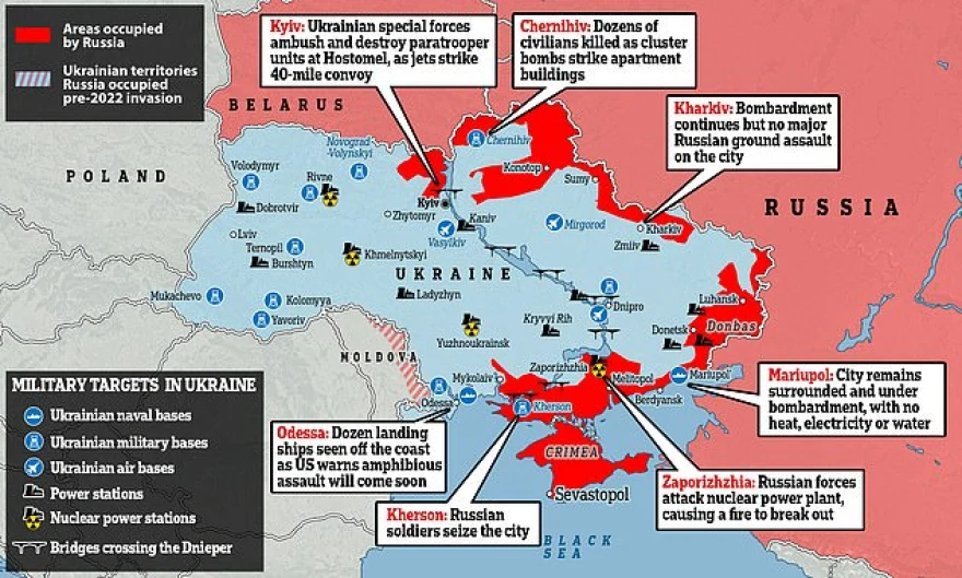 Η Μαριούπολη αντιμετώπισε μέρες «ανελέητων επιθέσεων», με τους κατοίκους να έχουν μείνει χωρίς ρεύμα και νερό μετά από ρωσικούς πυραύλους που έπληξαν κρίσιμες υποδομές. Είναι κατανοητό ότι η πόλη παραμένει στα χέρια της Ουκρανίας, αλλά οι βρετανικές μυστικές υπηρεσίες λένε ότι είναι «πολύ πιθανό» η Μαριούπολη να περικυκλώνεται από ρωσικές δυνάμεις.