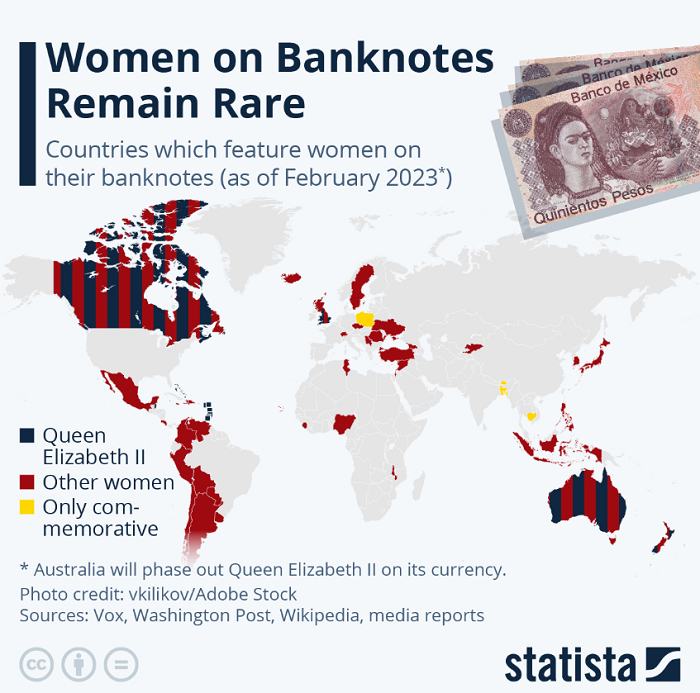 Όπως αναφέρει η ανάλυση του Statista, από το 2016 μέχρι το 2023 ο αριθμός των κρατών που απεικονίζουν γυναίκες στα χαρτονομίσματά τους αυξήθηκε ελαφρώς, φτάνοντας μόλις τα 46 παγκοσμίως.
