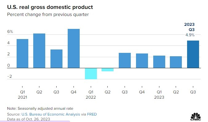 Συγκεκριμένα, τα προκαταρκτικά στοιχεία στις ΗΠΑ έδειξαν ότι το ΑΕΠ αναπτύχθηκε κατά 4,9% σε ετήσιο επίπεδο έναντι 2,1% στο β’ τρίμηνο του 2023. Η επίδοση του γ’ τριμήνου, μάλιστα, ήταν υψηλότερη των προβλεπόμενων (4,7% η μέση εκτίμηση).