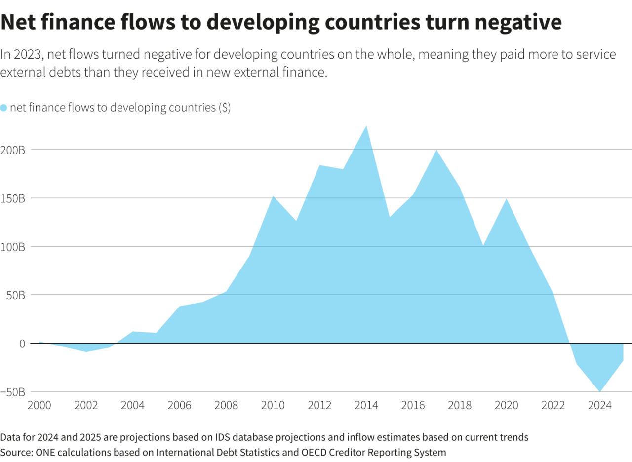 Τα στοιχεία της ONE Campaign δείχνουν ότι το 2022, 26 χώρες – συμπεριλαμβανομένων της Αγκόλα, της Βραζιλίας, της Νιγηρίας και του Πακιστάν – πλήρωσαν περισσότερα για την εξυπηρέτηση του εξωτερικού χρέους από όσα έλαβαν σε νέα εξωτερική χρηματοδότηση.