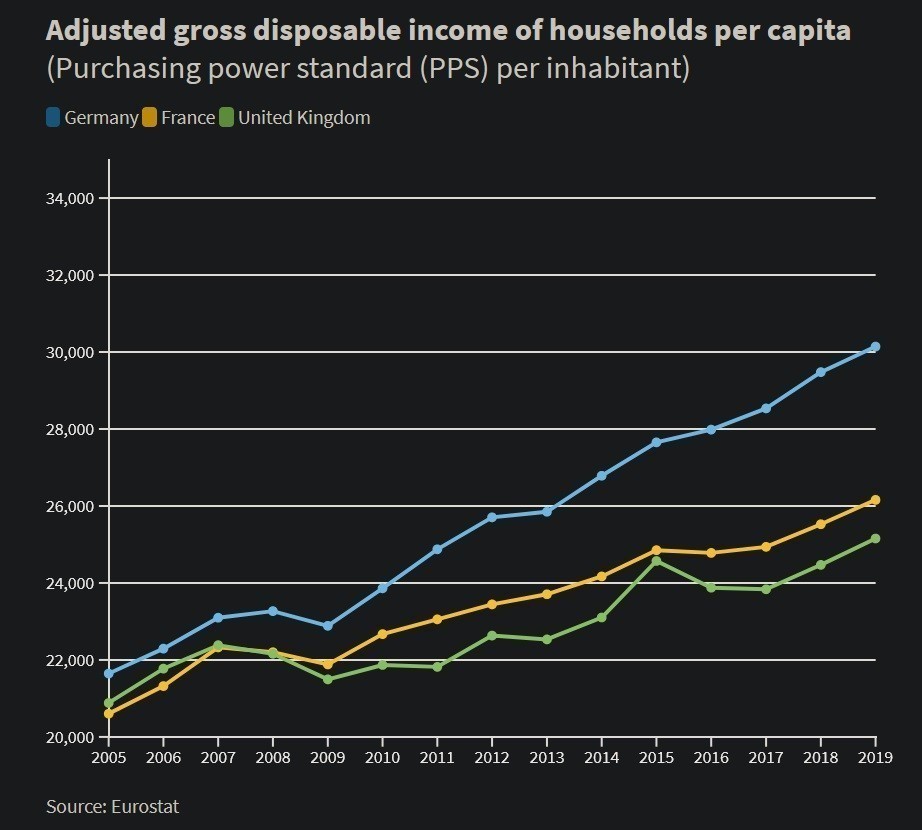 Το διαθέσιμο εισόδημα στη Γερμανία έχει επίσης επιδείξει σταθερή αναπτυξιακή πορεία. Οταν η Μέρκελ ανέλαβε την Καγκελαρία το 2005, τα επίπεδα του καταναλωτικού εισοδήματος σε Γερμανία, Βρετανία και Γαλλία βρίσκονταν σε παρόμοια επίπεδα. Παρ’ όλα αυτά, όσο πέρασαν τα χρόνια, η Γερμανία πήρε το προβάδισμα.